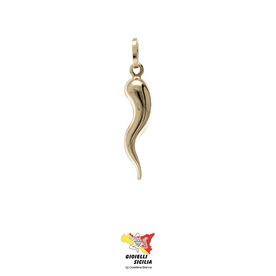 Ciondolo realizzato in Oro Giallo 18Kt 750°/oo, formato da un Corno detto anche Cornetto, simbolo per eccellenza della scaramanzia e capace di allontanare le cose negative, con una struttura in Oro Giallo di forma liscia ed allungata.