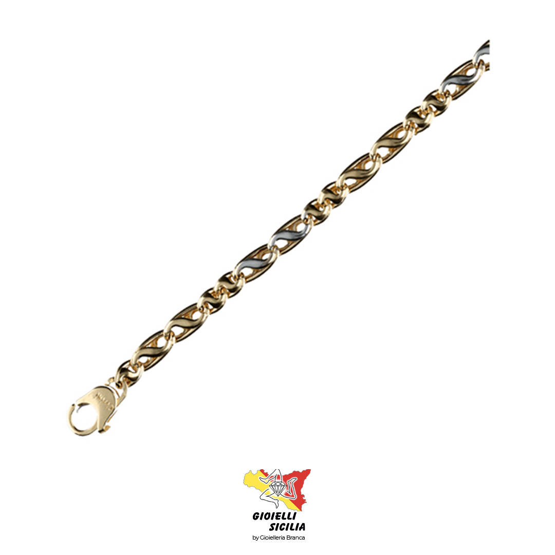 Collana realizzata in Oro Giallo/ Bianco 18Kt 750°/oo, modello a maglie che si alternano 2 maglie piccole in Oro giallo e 2 maglie grandi in Oro giallo/bianco, rendendo il gioiello ancora più particolare.