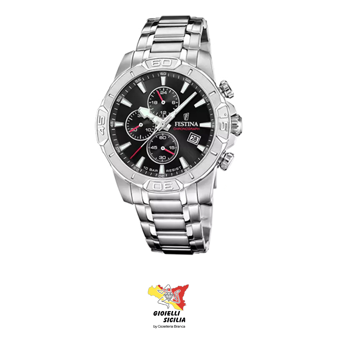 L’orologio FESTINA da uomo combina stile sportivo ed eleganza, offrendo prestazioni e design di alta qualità. Realizzato in acciaio 316L con finitura in PVD Rodio è dotato di un robusto bracciale in acciaio che garantisce comfort e resistenza nel tempo. Il modello cronografo presenta un quadrante nero, impreziosito da indici e lancette fosforescenti per una perfetta leggibilità anche al buio.